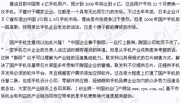 一款熱銷的洋品牌手機出現不到三個月,相似外觀和同樣功能的國產手機就以更低廉的價格迅速席卷市場。一位經銷商說:“這樣的手機比洋品牌要低上幾百甚至上千元,如果洋品牌一臺機器賺上千元的話,國產手機企業覺得只需要賺幾百元就夠了。”在成都太升南路的一家手機賣場里,大多數產品都是國產品牌,當你咨詢某個洋品牌的時候,導購員會賣力地推薦你去購買性價比更好的某款功能外觀相近的國產手機。[創業網-中國創業門戶網站m.390056.com]在這里,國產手機是紅花,而洋品牌成了地道的綠葉。