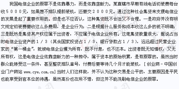 我指出電信企業有原罪,決不是有意來貶低電信行業,而是在市場經濟條件下,在法治社會,應該如何對待自己的壟斷地位。有人可能說,電信企業這些做法,都是得到政府允許的,不能算作原罪。但政府的允許不等于是合理的。馬克思揭露英國的資本原始積累,所有圈地運動,都有國會的立法,而這種做法卻遭到社會正義的譴責。馬克思說:“而對他們的這種剝奪的歷史是用血和火的文字載入人類的編年的。”(同上,783頁)前幾年有一件案例,大家可能還記憶猶新,一個壟斷部門被告上法庭:即一個律師狀告鐵道部春節火車票漲價是非法的,違背了市場原則。鐵道部說,漲價為了使客運高峰分流。那么人們首先要問:為什么不采取降價把客流吸引到客運低谷;二是漲價憑什么,一沒有提高服務質量,一個一百多個座位的車箱擠了二百人,水泄不通,服務質量下降了;[創業網-中國創業門戶網站m.390056.com]二是沒有增加成本,在不提價的情況下就可以增加一倍收入;三是春節客運很大一部分是農民工,他們辛辛苦苦一年掙點錢,歡歡喜喜回家過年,鐵道部門利用春節火車票漲價,從他們口袋掏錢,這是趁火打劫,是敲竹杠。