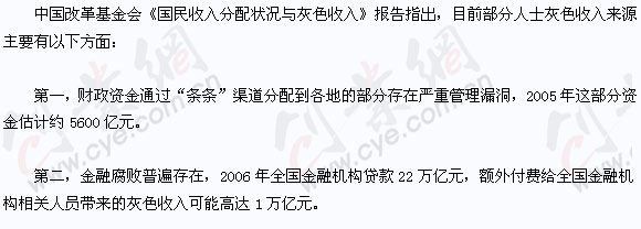 目前城鎮(zhèn)最高與最低收入10%家庭間的人均收入差距約31倍,而不是統(tǒng)計顯示的9倍。城鄉(xiāng)合計,全國最高與最低收入10%家庭間的人均收入差距約55倍,而不是按統(tǒng)計數(shù)據(jù)推算的21倍。中國實際收入差距要遠大于統(tǒng)計顯示的水平。目前收入分配差距過大的原因,主要不在于市場化,而在于制度不健全所導致的腐敗和灰色收入。這里將非法收入、違規(guī)違紀收入、按照社會公認的道德觀念其合理性值得質(zhì)疑的收入,及其他來源不明的收入,統(tǒng)稱為灰色收入。