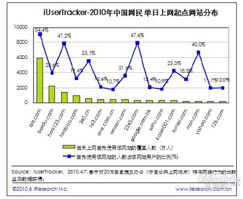 從2010年從《iResearch-2010年中國(guó)網(wǎng)民單日行為研究報(bào)告》中可以看出,QQ、baidu、HAO123是2010年中國(guó)網(wǎng)民最主要的上網(wǎng)入口。根據(jù)下圖中的藍(lán)色折線(xiàn)反映,導(dǎo)航類(lèi)網(wǎng)站中有很大比例的網(wǎng)民(近50%)將其作為上網(wǎng)的入口,網(wǎng)址導(dǎo)航站的上網(wǎng)入口作用進(jìn)一步得到深化。