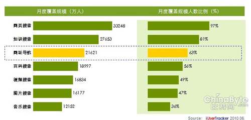 三年來(lái),網(wǎng)址導(dǎo)航核心企業(yè)的覆蓋規(guī)模呈現(xiàn)上升的趨勢(shì),各網(wǎng)站之間呈現(xiàn)出一定的連動(dòng)形態(tài),上升趨勢(shì)呈現(xiàn)一致性。特別是2008年以后,網(wǎng)址導(dǎo)航行業(yè)流量有大幅增長(zhǎng)。從月度覆蓋規(guī)模上來(lái)看,在搜索服務(wù)行業(yè)中網(wǎng)站導(dǎo)航行業(yè)(21,621萬(wàn)人)排第三位,僅次于網(wǎng)頁(yè)搜索和知識(shí)搜索,整個(gè)搜索服務(wù)行業(yè)月度覆蓋規(guī)模上呈增長(zhǎng)狀態(tài),其中網(wǎng)址導(dǎo)航行業(yè)三年內(nèi)增長(zhǎng)幅度高達(dá)246%,是整個(gè)搜索服務(wù)行業(yè)中三年內(nèi)提升幅度最大的。