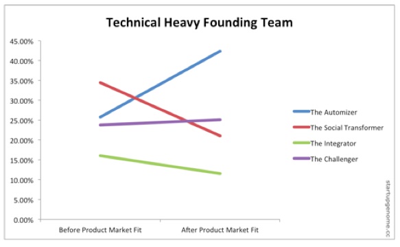 在我們的數(shù)據(jù)中,35%的偏重商業(yè)的創(chuàng)始團(tuán)隊在產(chǎn)品適應(yīng)市場之前選擇了“自主型“,但在產(chǎn)品適應(yīng)市場之后只有12%的偏重商業(yè)的創(chuàng)始團(tuán)隊選擇了”自主型“。這說明偏重商業(yè)型的創(chuàng)始團(tuán)隊并不太適應(yīng)”自主型“的創(chuàng)業(yè)公司。