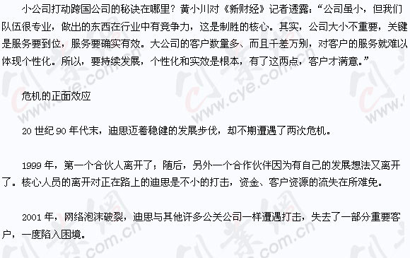這兩次危機促使黃小川開始思變。黃小川意識到將公司的發展僅僅維系于一個行業,風險很大,他下定決心改變這一被動局面。迪思開始轉型,業務范圍從IT業向房地產、汽車、金融、快速消費品等行業和領域拓展。業務向外延伸的同時,迪思服務的核心理念也發生了變化,從單純的市場執行角色向咨詢顧問角色轉變。