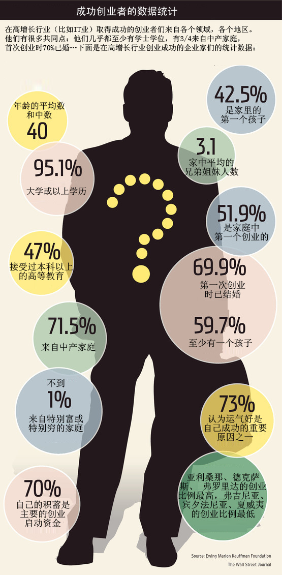 很多創業者一直在問自己一個問題:我創業能成功嗎?Who kowns?但成功的創業者多多少少還是有一些共同點,下面我們就來看看華爾街日報對在高增長行業創業成功的創業者們進行的一項調查統計,當然調查的數據采樣是在美國,國情有別,供國內的創業者們參考: