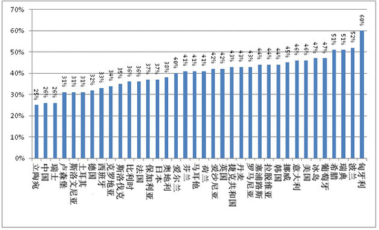2009年,蓋洛普(Gallup Organization)為歐盟委員會(European Commission)組織了一項調查,涉及到36個國家的人群,下列圖表展示了調查結果。這項Cye.com.cn調查顯示,立陶宛只有25%的人口認為破產是他們創業最大的兩種恐懼之一,中國也僅有26%的創業者害怕破產,與瑞士并列第二,而匈牙利的這一比例高達60%。