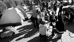 家長在北京朝陽區某幼兒園門口搭起帳篷排起長隊等待報名。尹亞飛 攝