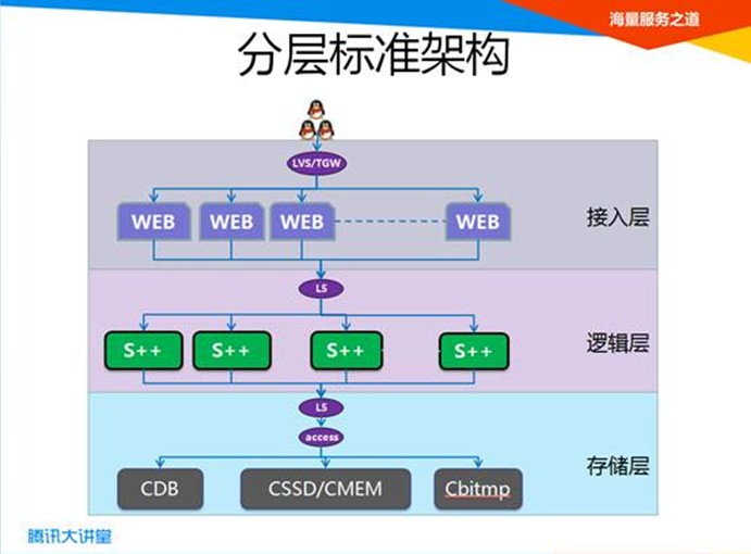 “規范技術架構并不是一件容易的事情”,在規范技術架構主題中,趙建春指出,“我們每個地方的規范和約束花了大概2年的時間,才把這樣一個比例從無發展到80%、90%的覆蓋率。使業務架構變成接入層以qzhttp為主,邏輯層以spp(通用socketserver)為主,數據層以cdb cmem/cssd cbitmp為主并結合lvs/tgw L5 進行容錯的高度標準化運營體系。”