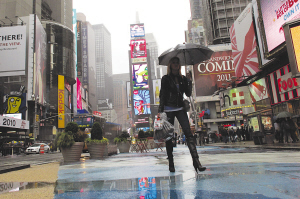 紐約近日氣溫驟降,最低只有12攝氏度,一名行人冒雨走在時代廣場上。