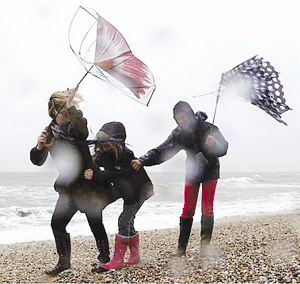英國近日遭遇強風天氣,幾位行人頂風艱難行走