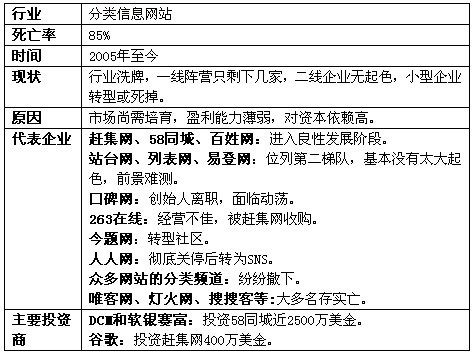據(jù)計(jì)世資訊此前數(shù)據(jù)顯示,2007年,中國的獨(dú)立分類信息網(wǎng)站有近200家,加上其它網(wǎng)站的分類頻道,總數(shù)近3000個(gè)。如今,在經(jīng)過行業(yè)洗牌后,除了最新拿到融資的幾個(gè)網(wǎng)站之外,接近九成網(wǎng)站已經(jīng)失去了獨(dú)立成長(zhǎng)的機(jī)會(huì)。