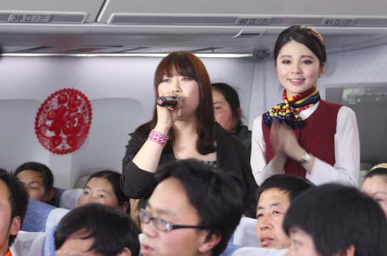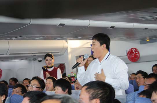 大家一起喊出他的名字“劉大成”,原來大成就坐在朋友們中間,大家好,能和農民工朋友們坐一趟航班回家過年,太幸福了!讓我們一起唱首歌,《咱們工人有力量》,現場頓時響起了嘹亮的歌聲,農民工朋友這么近的距離和歌手一起還是頭一次呢?
