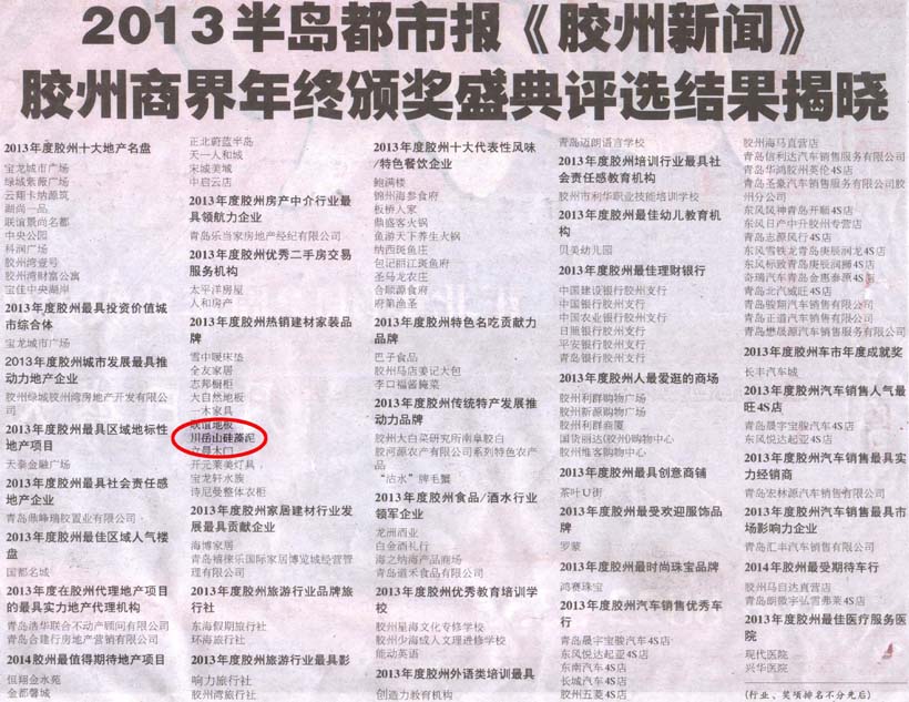 在《半島都市報》組織的“2013膠州商界年終頒獎盛典”評選活動中,青島川山新材料有限公司的“川岳山”硅藻泥榮獲2013年度膠州熱銷建材家裝品牌。