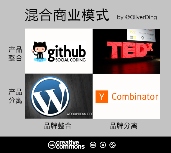 除了WordPress之外,還有其他的一些模式可以參考。我構思了一個矩陣模型,歸納了四種模式。這個矩陣包括產品和品牌兩個維度。每個維度都包括整合和分離兩個特征。