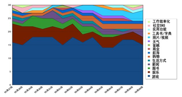 首先,把App Store里的“TOP付費”和“TOP免費”的排名作為目標,調查從5月27日-6月9日這兩周內的排名情況。每天進入排行榜前30位的應用程序,按類別進行統計和確認排名情況。