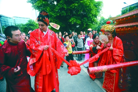本報訊 (實習記者 楊林)昨日,江北某酒店,來自摩洛哥的非洲小伙子麥赫迪·謝爾博和他的重慶新娘王柳青舉辦了婚禮。歷時20分鐘的婚禮,全程按照唐朝婚禮模式進行,“結發之禮”、“同牢之禮”、“合巹之禮”,讓很多到場嘉賓感覺“穿越時空”。